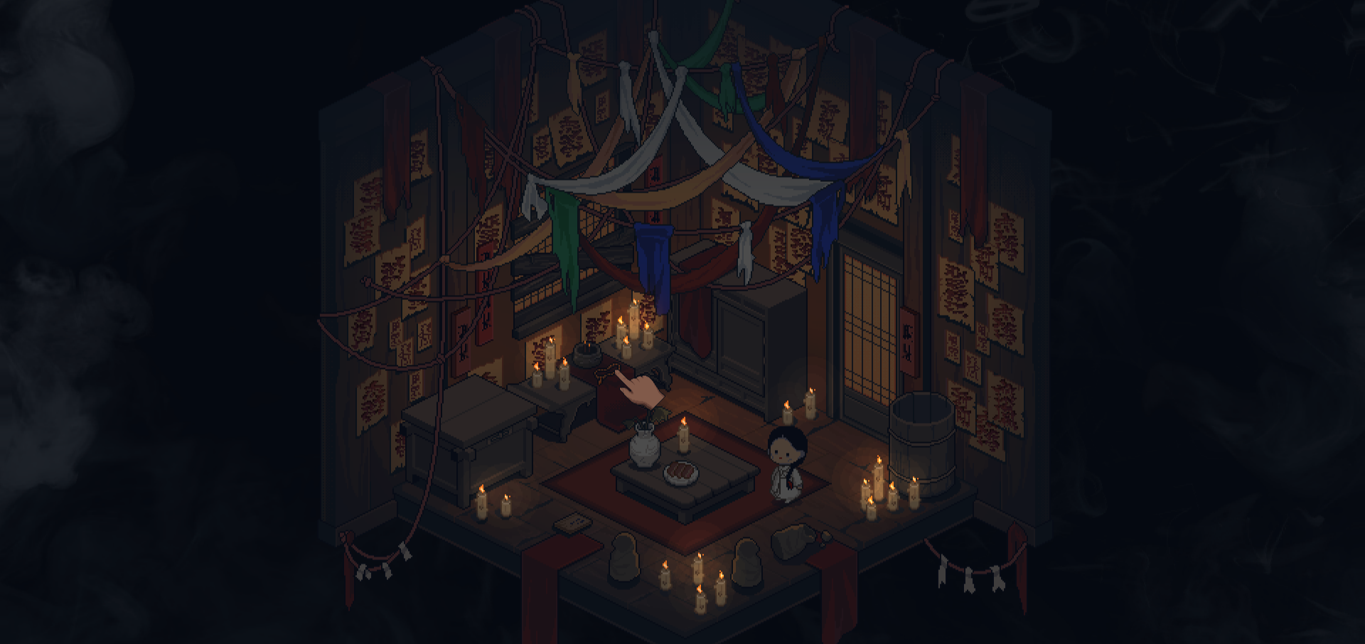 You are trapped inside the shrine of a yeommae mudang, a shaman who kidnaps children, starves them, and seals their souls into bamboo tubes to sell as curses.